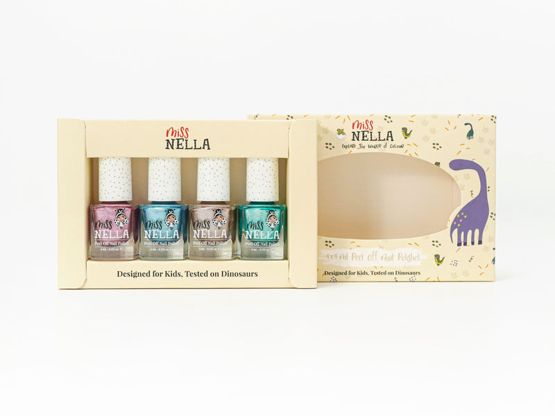 Give your little ones the freedom to explore their creativity and fashion sense with this Miss Nella 4 pack collection. It includes 4 water-based, peel-off kids nail polishes.