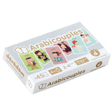 A pair of sets with 44 + 1 cards representing all countries of the Arab League, plus 3 information cards with a list of different flags and names of countries and 7 game rules card in the following languages: French, Arabic, English, Italian, Spanish, German and Dutch.